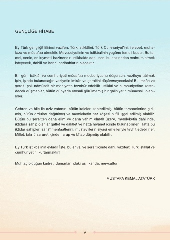 Ey Türk gençliği! Birinci vazifen, Türk istiklâlini, Türk Cumhuriyet'ini, ilelebet, muha-